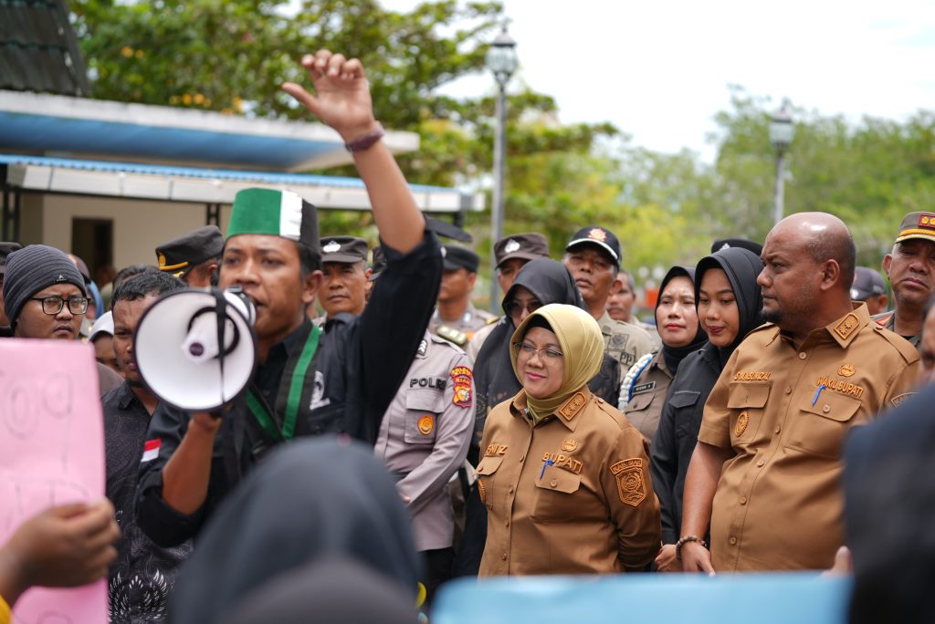 Aksi tersebut di tanggapi langsung Bupati Siak, Afni Zulkifli, bersama Wakil Bupati, Syamsurizal, yang turun menemui para mahasiswa.
